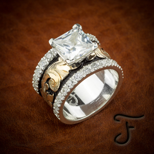 With a blackened background sitting behind some of the most beautiful 10kt gold floral over-lay you will see anywhere and topping it off, is a row of sparking 1 mm CZ's on each side of the center stone. WOW!!!!